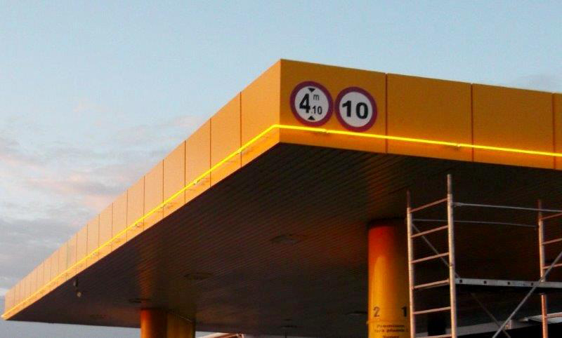 Conturul luminos specific benzinariilor se realizeaza cu tuburi cu descarcari in gaze spectrale (Neon TGS) cu un diametru foarte mare (38 mm), fiind singurii din tara care detinem instalatii profesionale pentru aceasta aplicatie.